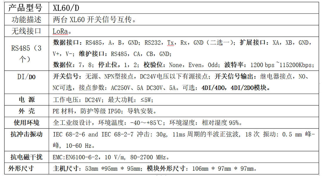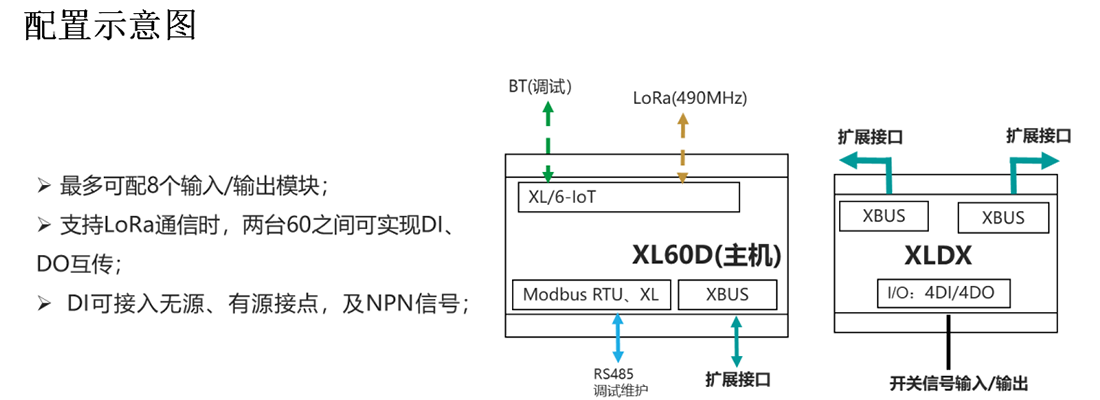 XL60D的通信方式是LoRa無線傳輸方式,每臺(tái)XL60D主機(jī)模塊,最多配兩個(gè)開關(guān)量I/O模塊。