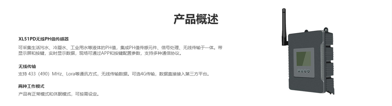 XL51PD無線PH值傳感器,可采集生活污水、冷凝水、工業(yè)用水等液體的PH值,集成PH值傳感元件、信號處理、無線傳輸于一體。帶顯示屏和按鍵,實時顯示數(shù)據(jù),現(xiàn)場可通過APP和按鍵配置參數(shù),支持多種通信協(xié)議。