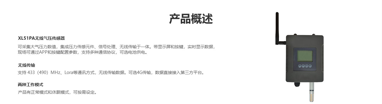 XL51PA無線氣壓傳感器,可采集大氣壓力數(shù)值,集成壓力傳感元件、信號處理、無線傳輸于一體。帶顯示屏和按鍵,實時顯示數(shù)據(jù),現(xiàn)場可通過APP和按鍵配置參數(shù),支持多種通信協(xié)議。