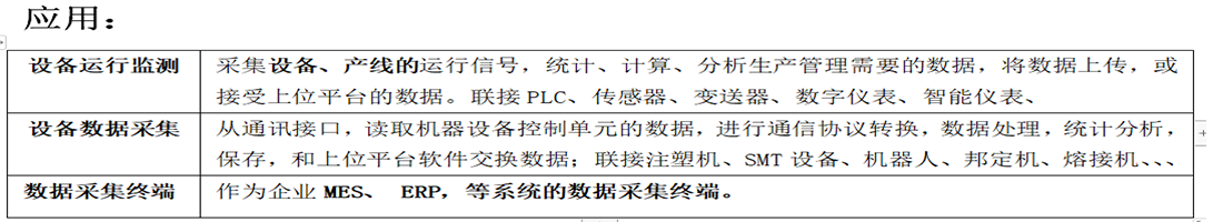 1、 采集:運行狀態(tài)(啟動、運行、待機、停機、故障、試機);產量;工藝參數(轉速、時間、壓力、溫度、流量、位移、振動);能耗(用電參數及電能消耗,汽、氣、水消耗);