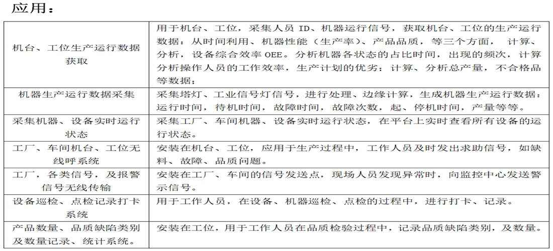 XL69機(jī)臺(tái)監(jiān)控裝置,采集機(jī)臺(tái)、工位人、機(jī)生產(chǎn)運(yùn)行信號(hào):機(jī)器運(yùn)行狀態(tài)、人員ID信息及操作時(shí)間數(shù)據(jù),獲取機(jī)器、人員生產(chǎn)運(yùn)行數(shù)據(jù),并對(duì)機(jī)臺(tái)的運(yùn)行數(shù)據(jù)進(jìn)行邊緣計(jì)算,統(tǒng)計(jì)、分析機(jī)臺(tái)的設(shè)備效率、時(shí)間效率、品質(zhì)效率,及綜合效率。通過(guò)無(wú)線方式,上傳獲取的數(shù)據(jù)。