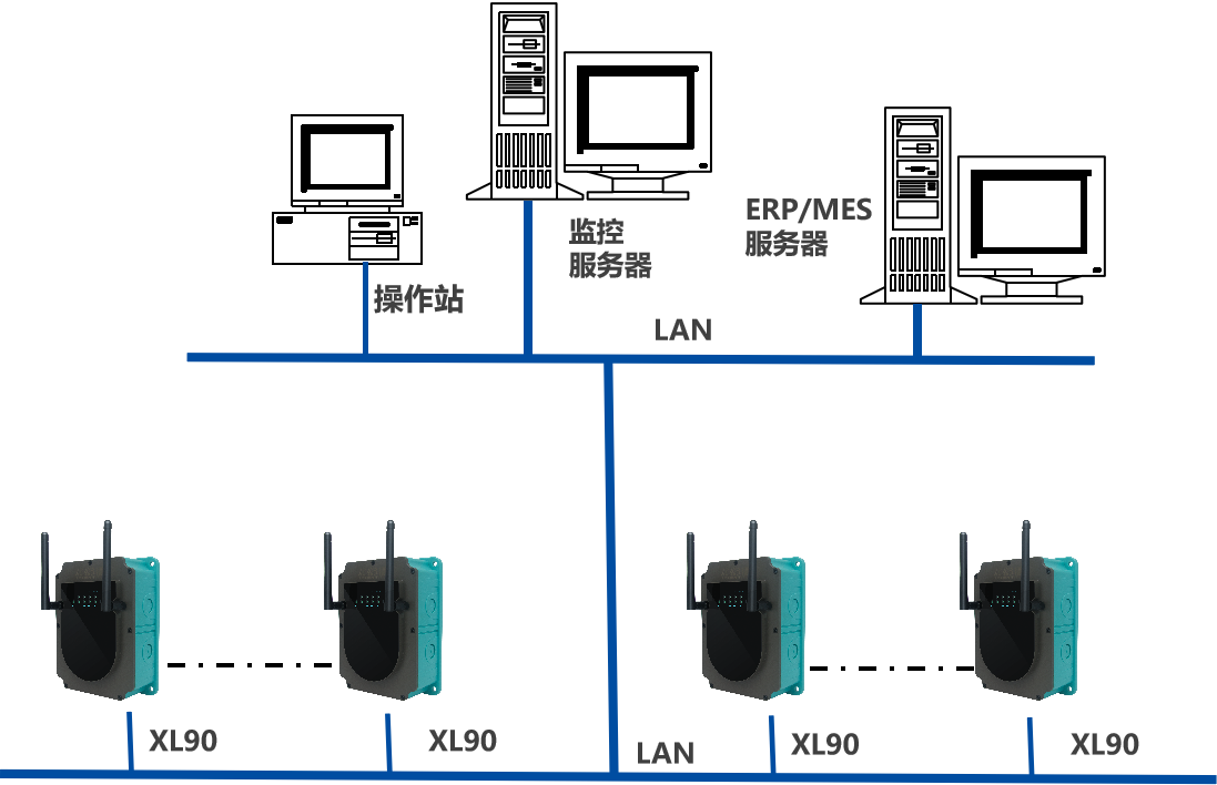 XL90物聯(lián)網(wǎng)關(guān),是系統(tǒng)的核心,從XL60上讀取數(shù)據(jù),進(jìn)行協(xié)議轉(zhuǎn)換、通訊處理,通過(guò)企業(yè)內(nèi)部LAN,推送數(shù)據(jù)至企業(yè)生產(chǎn)監(jiān)控平臺(tái)