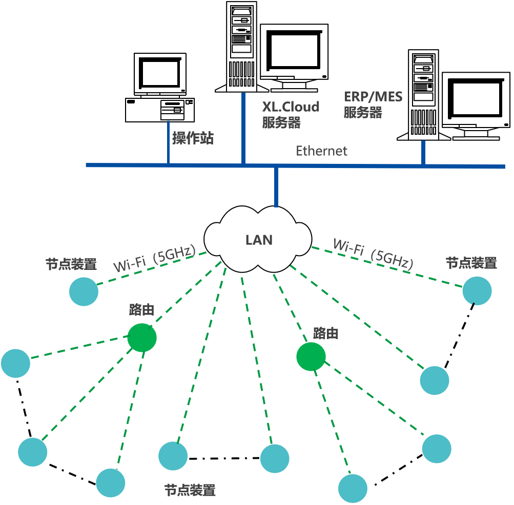 節(jié)點(diǎn)裝置(智能采集裝置/智能采集終端),通過(guò)Wi-Fi(5GHz),接入企業(yè)內(nèi)部LAN,推送設(shè)備生產(chǎn)數(shù)據(jù),至企業(yè)生產(chǎn)監(jiān)控平臺(tái)
