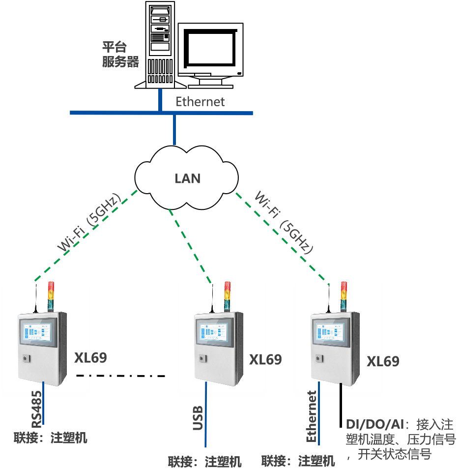 XL69智能采集終端,是系統(tǒng)的核心裝置,對(duì)采集的信號(hào)、數(shù)據(jù),進(jìn)行處理、統(tǒng)計(jì)、計(jì)算,并生成單機(jī)設(shè)備的數(shù)據(jù)庫(kù),通過(guò)企業(yè)內(nèi)部LAN,推送數(shù)據(jù)至企業(yè)生產(chǎn)監(jiān)控平臺(tái)