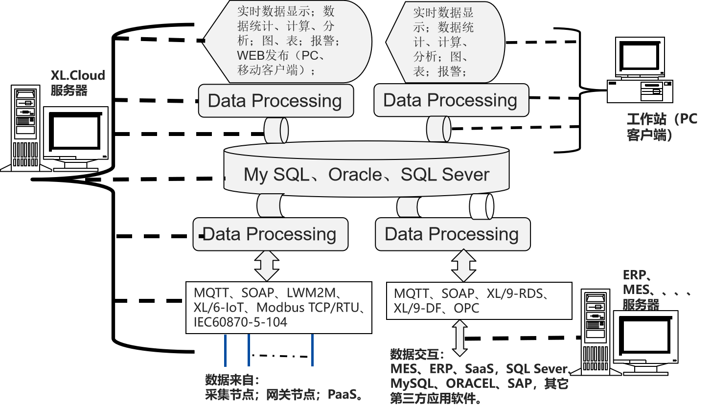 支持MQTT、LWM2M、SOAP,XL/6-IoT、XL/9-DB、XL/9-RDS,等等通信協(xié)議,并可和第三方數(shù)據(jù)庫(kù),Oracle、SAP等交換數(shù)據(jù)