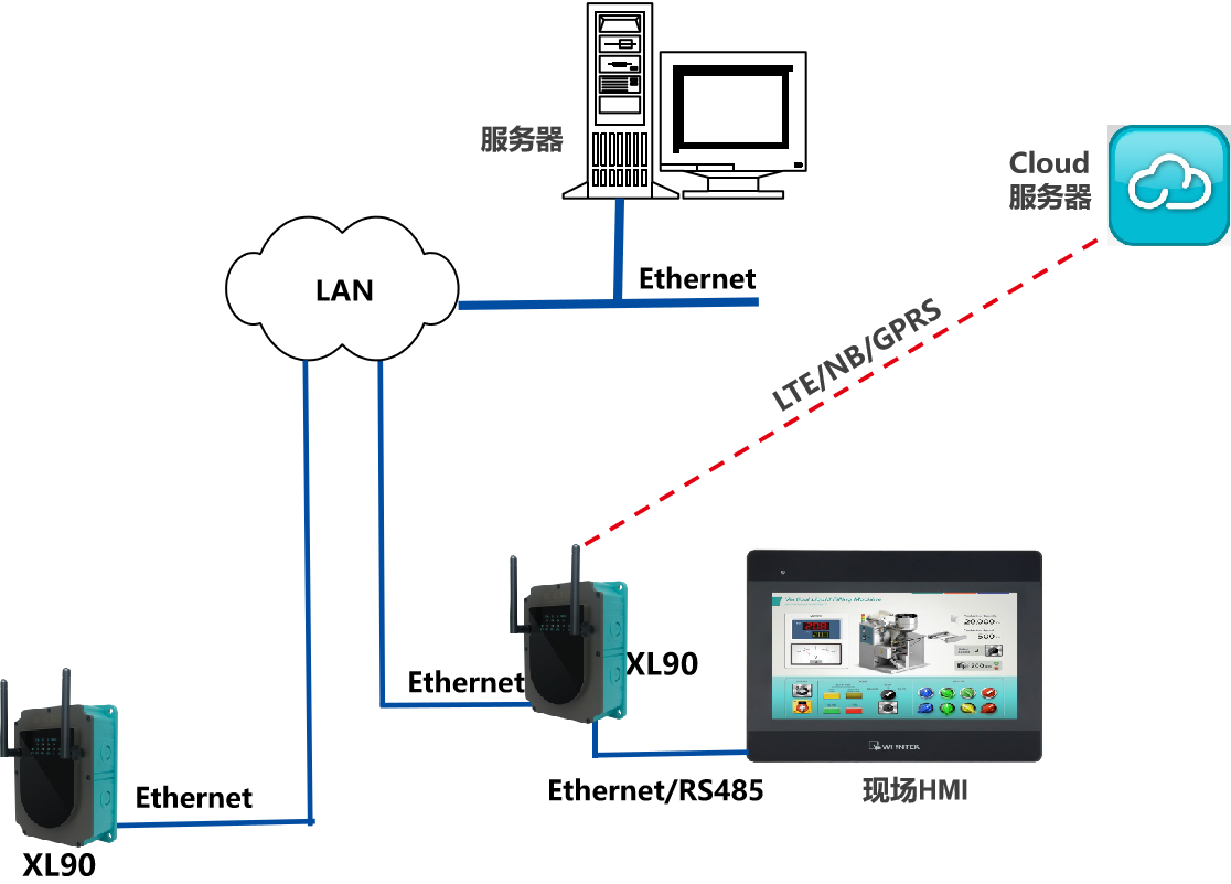 XL90,將數(shù)據(jù)上傳給企業(yè)內(nèi)部的多個(gè)系統(tǒng)軟件平臺(tái);通過(guò)LTE(4g)/NB/GPRS將數(shù)據(jù)上傳至云服務(wù)器