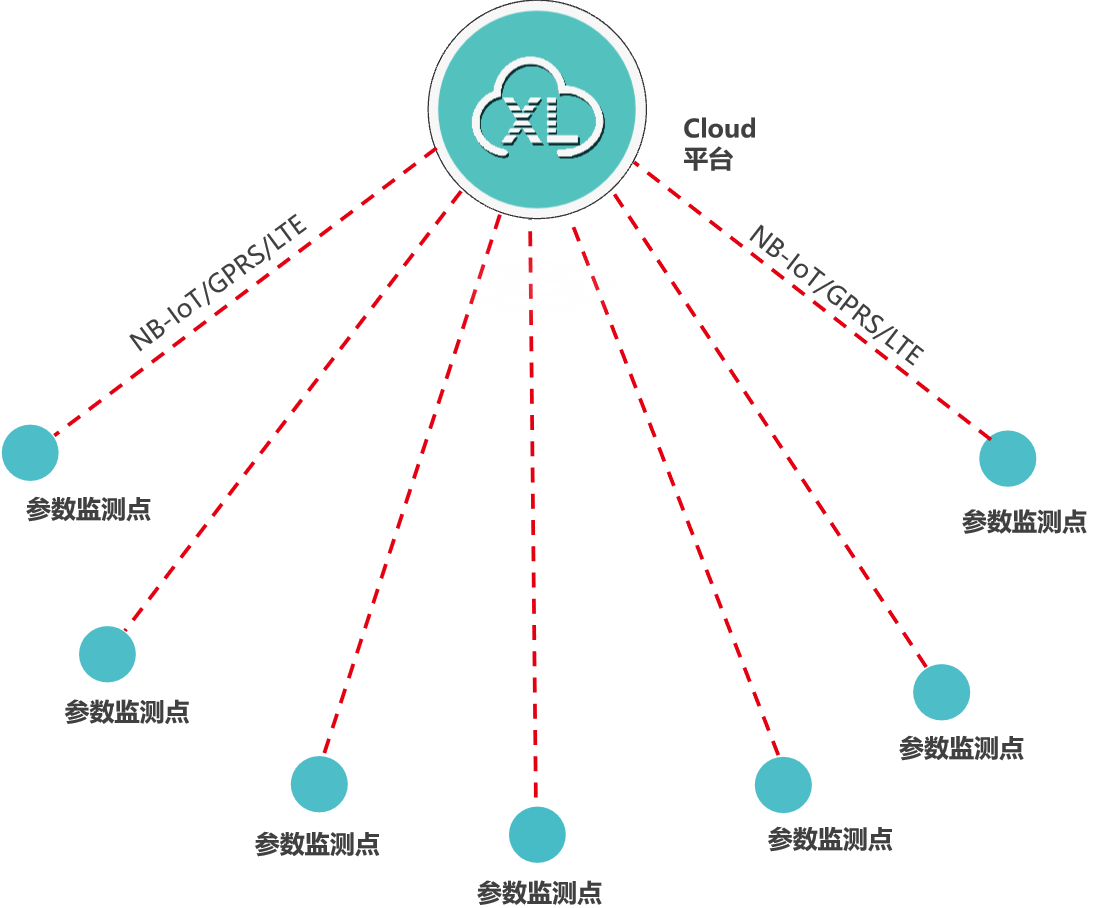 類似泵房、水廠、水源井等場所的數(shù)據(jù)監(jiān)測,監(jiān)測點的數(shù)據(jù)先上傳至XL90物聯(lián)網(wǎng)關(guān),再通過NB/GPRS/LTE轉(zhuǎn)發(fā)數(shù)據(jù)至云平臺,此種情況,數(shù)以后在量大時,可選LTE(4g)方式