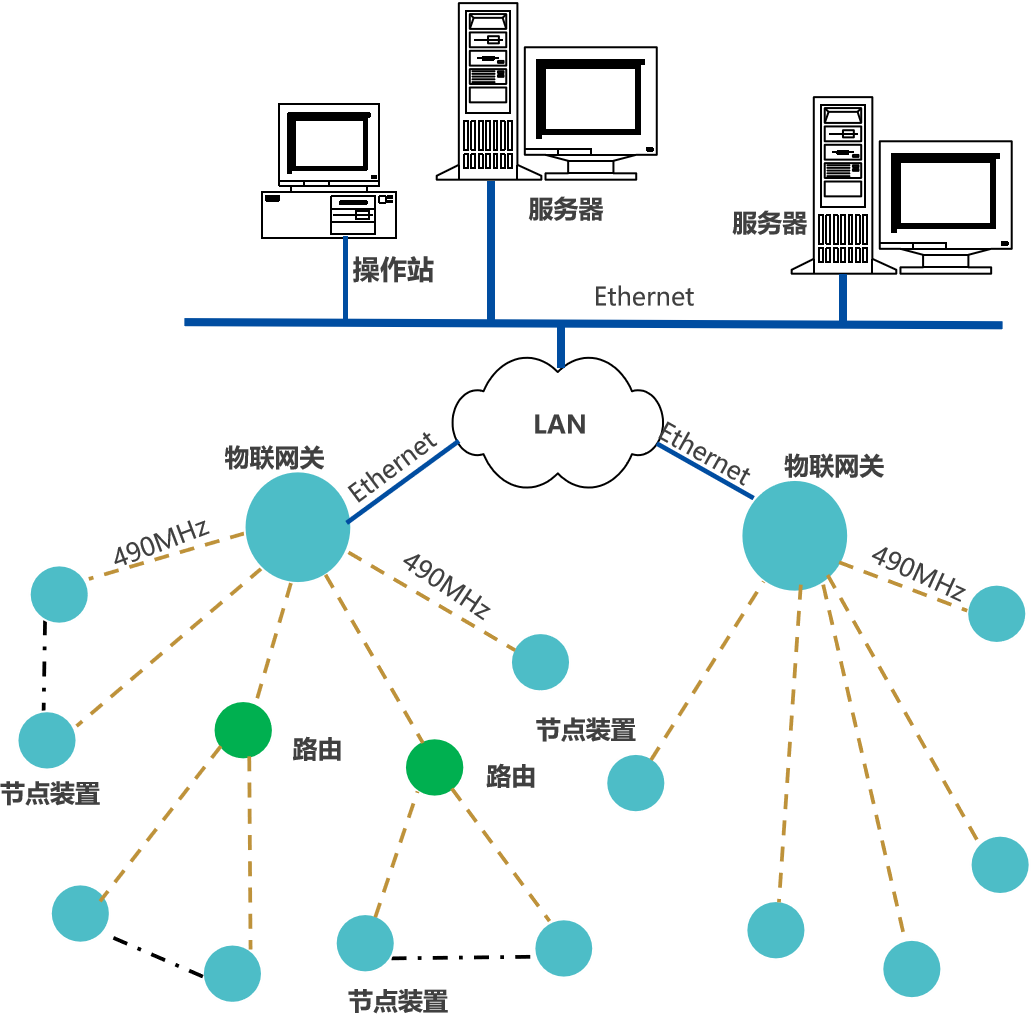 節(jié)點(diǎn)裝置(智能轉(zhuǎn)換器/智能轉(zhuǎn)換裝置),通過(guò)490MHz上傳數(shù)據(jù)至物聯(lián)網(wǎng)關(guān),網(wǎng)關(guān)通過(guò)Ethernet接入企業(yè)內(nèi)部LAN,推送設(shè)備生產(chǎn)數(shù)據(jù),至企業(yè)生產(chǎn)監(jiān)控平臺(tái)
