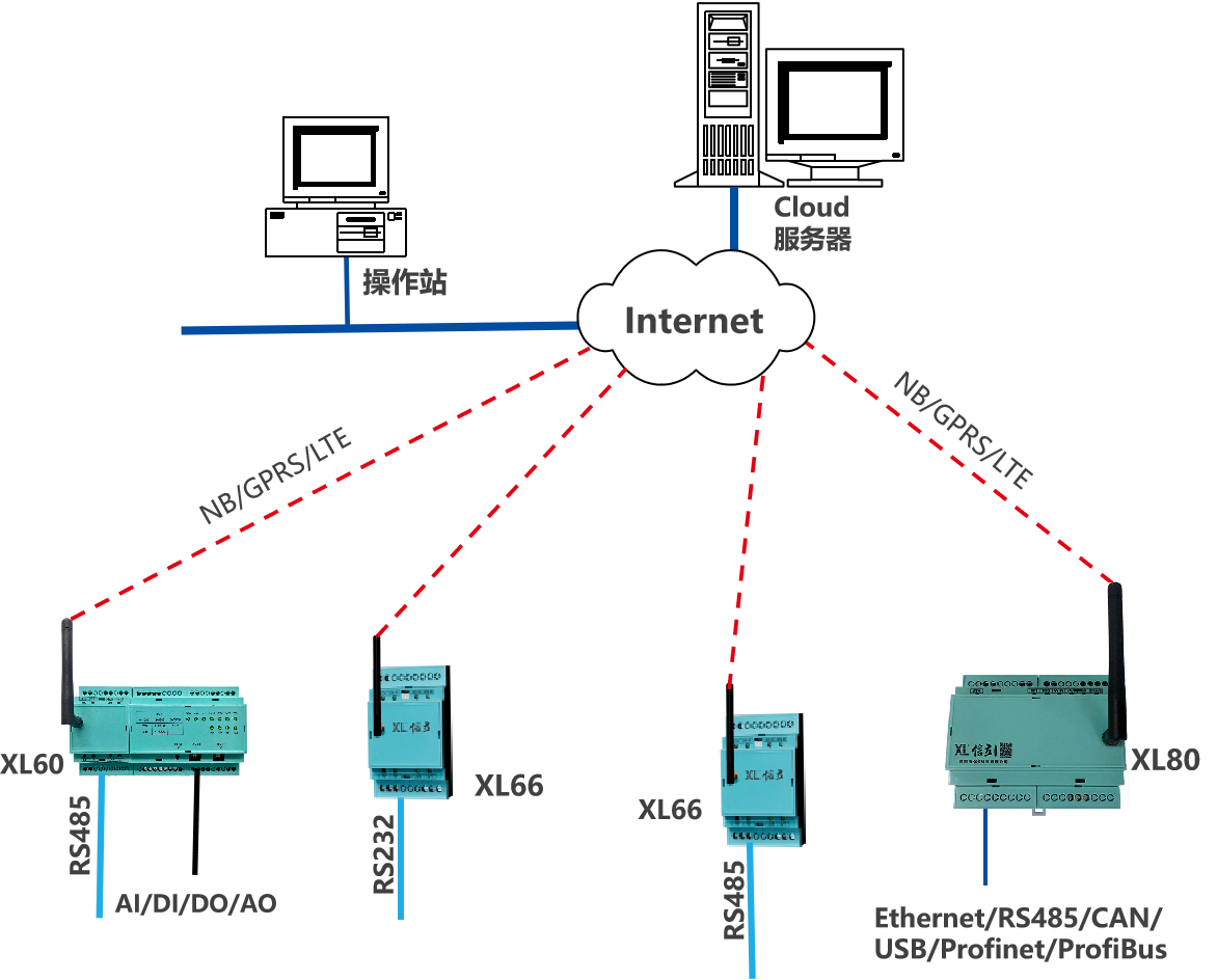 XL60智能采集裝置,通過(guò)RS485接口讀取數(shù)據(jù),DI、DO、AI、AO接口采集、輸出信號(hào),NB/GPRS/LTE通信;推薦NB/GPRS