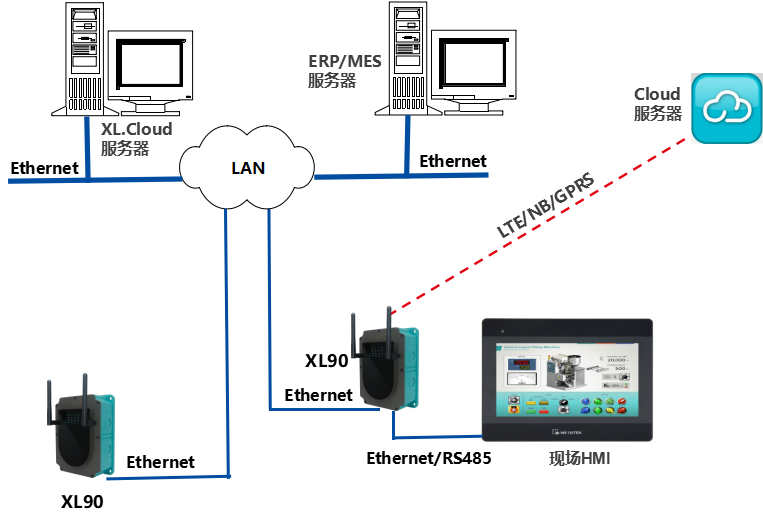 XL90將數(shù)據(jù)轉(zhuǎn)發(fā)給現(xiàn)場HMI;將數(shù)據(jù)上傳給企業(yè)內(nèi)部的多個系統(tǒng)軟件平臺;通過LTE(4g)/NB/GPRS將數(shù)據(jù)上傳至云服務器