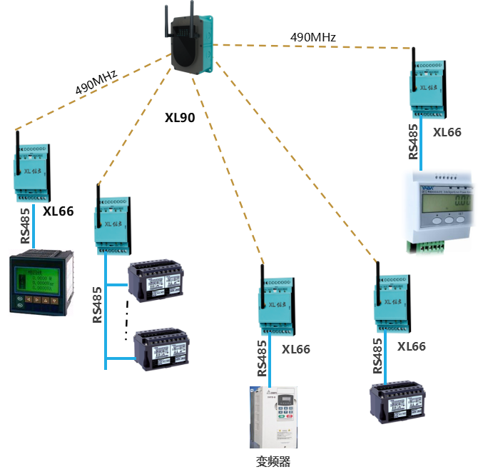 1臺XL66智能轉(zhuǎn)換器,通過RS485總線,聯(lián)接多臺電力監(jiān)控表或其它裝置,建議不超過16臺