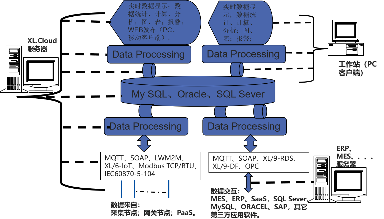 支持MQTT、SOAP,XL/6-IoT、XL/9-DB、XL/9-RDS,等等通信協(xié)議,并可和第三方數(shù)據(jù)庫,Oracle、SAP等交換數(shù)據(jù);