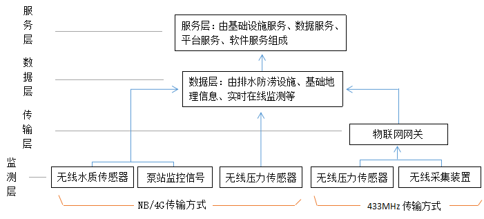 ?2、傳輸層:傳輸層主要有無線采集裝置、無線壓力傳感器、NB、4G、Lora無線傳輸網絡組成。