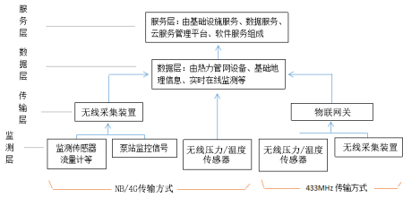 1、傳感器監(jiān)測層:主要有各種監(jiān)測傳感器組成,比如壓力、溫度、流量、地理與換熱站監(jiān)控設備組成。