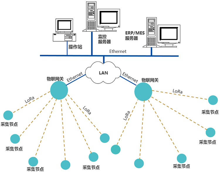 每臺(tái)裝置,通過LoRa無線通訊上傳數(shù)據(jù)至物聯(lián)網(wǎng)關(guān),網(wǎng)關(guān)通過Ethernet或Wi-Fi,接入LAN,推送數(shù)據(jù)至企業(yè)生產(chǎn)管控服務(wù)器。