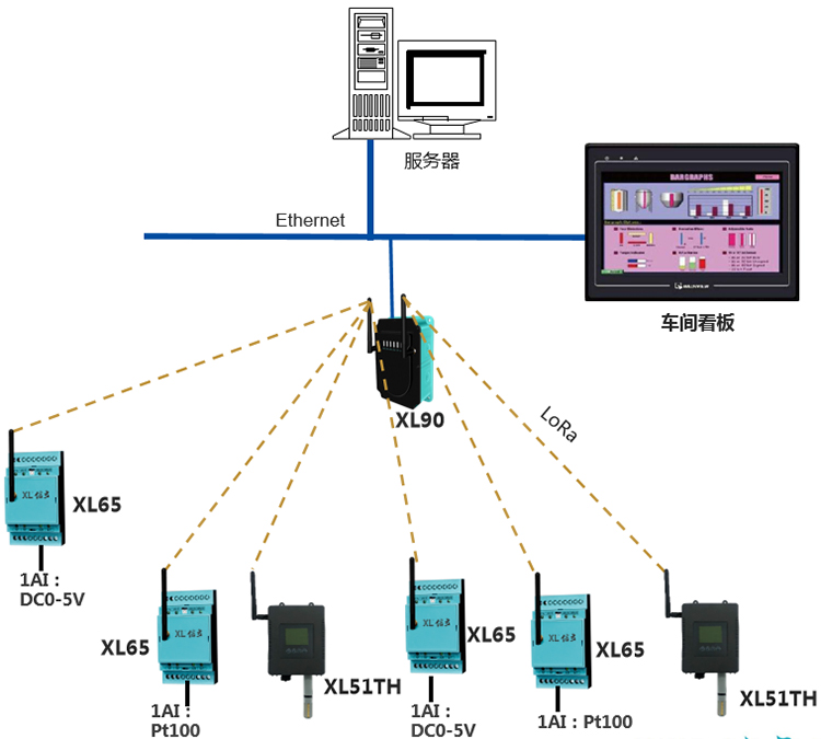基于XIoT技術(shù)的絲印機(jī)電池電壓、電機(jī)溫度、絲印空間溫、濕度數(shù)據(jù)采集系統(tǒng),選擇XL65無線采集裝置,和XL51TH溫、濕度傳感器,采集相關(guān)參數(shù)的數(shù)據(jù),無線上傳至XL90物聯(lián)網(wǎng)關(guān):