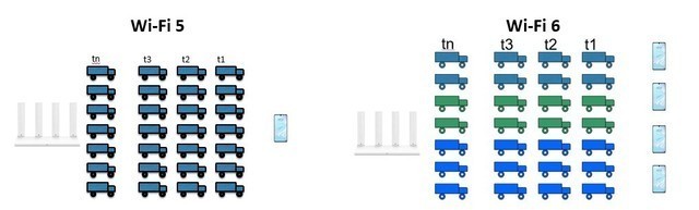 我們可以將路由器向設(shè)備傳輸?shù)膱鼍氨扔鞒梢粋€車隊(duì),在WiF i5標(biāo)準(zhǔn)下,同一時(shí)刻出發(fā)車隊(duì)只能派送到一個客戶,即使有空車也照常發(fā)車,如果有車出現(xiàn)故障(受干擾),整個車隊(duì)都無法發(fā)車。而在WiFi 6標(biāo)準(zhǔn)下,同一時(shí)刻出發(fā)的一個車隊(duì),可以將相鄰的最少26輛車組成一個小隊(duì),每個小隊(duì)可以派送到不同的客戶,如果有車出現(xiàn)故障(受干擾)只影響所在的小隊(duì)。
