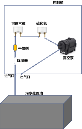 l 過程:用聚四氟乙烯管,聯(lián)接整個氣體通路。管直接伸入污水池,聯(lián)接控制箱進氣口,氣體從進氣口,至過濾器、除濕器,至傳感器探頭進、出氣口(兩臺傳感器的進、出氣口串聯(lián)),至真空泵抽氣口,從真空泵排氣口聯(lián)接控制箱出氣口;