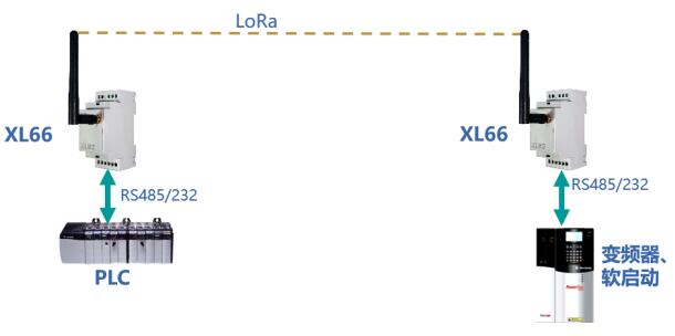 對于任意2臺帶RS485、232通信接口的設(shè)備,可分別與一臺XL66通過其RS485、232通信接口連接,其數(shù)據(jù)通過這2兩臺XL66,以無線通信方式實(shí)現(xiàn)數(shù)據(jù)透傳,從而免去現(xiàn)場繁雜的施工布線。