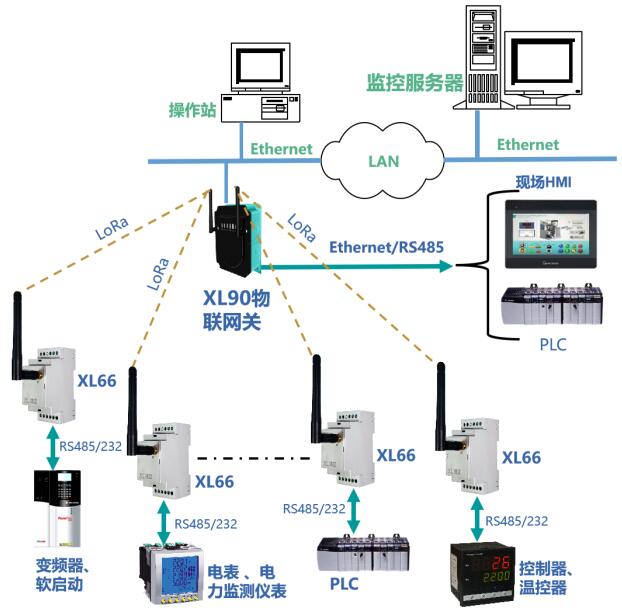 帶RS485或232通信接口的控制器、二次儀表、變送器等設(shè)備,通過通信接口與XL66連接,XL66通過LoRa無線通信方式將數(shù)據(jù)上傳至XL90或XL95物聯(lián)網(wǎng)關(guān),網(wǎng)關(guān)通過以太網(wǎng)或RS485,上傳數(shù)據(jù)至監(jiān)控平臺、PLC、觸摸屏、控制器等設(shè)備。從而實(shí)現(xiàn)有線串口設(shè)備的無線聯(lián)網(wǎng)。