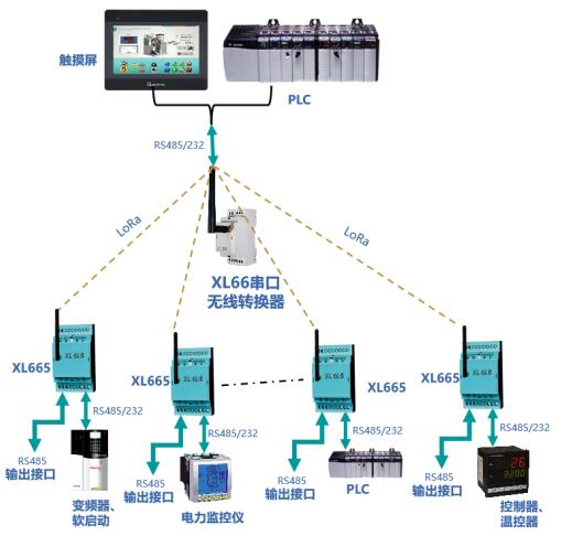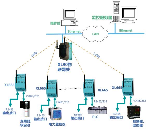 通過LoRa無線傳輸模塊輸出的數(shù)據(jù),可上傳至XL90物聯(lián)網(wǎng)關接入監(jiān)控軟件平臺,或通過XL66串口無線轉換器,與PLC、觸摸屏等通信。