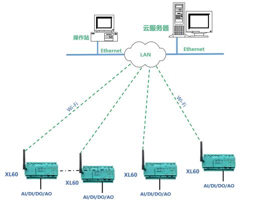 方案二:對于覆蓋Wi-Fi的區(qū)域,XL60無線采集裝置可直接通過Wi-Fi接入局域網,通過LAN直接推送數據至監(jiān)控服務器。