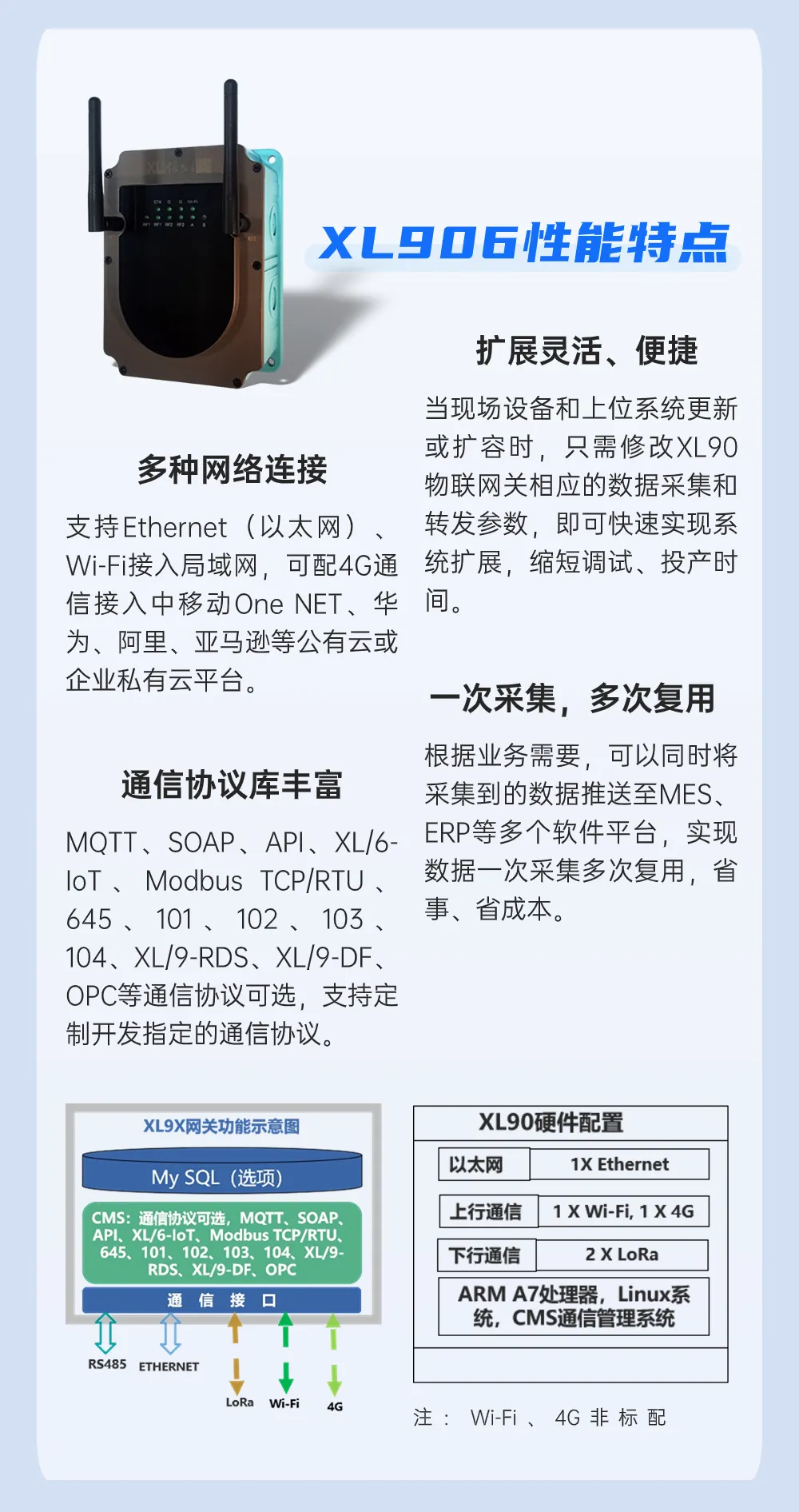XL906物聯(lián)網(wǎng)關(guān)是信立工業(yè)物聯(lián)網(wǎng)(XloT)的核心,是節(jié)點(diǎn)和平臺(tái)之間的通訊樞紐和橋梁,啟動(dòng)、管理通信網(wǎng)絡(luò),協(xié)調(diào)節(jié)點(diǎn)通信,實(shí)現(xiàn)通信數(shù)據(jù)管理、協(xié)議轉(zhuǎn)換,向多平臺(tái)轉(zhuǎn)發(fā)數(shù)據(jù),構(gòu)建更穩(wěn)定、更可靠、更安全的無(wú)線通信網(wǎng)絡(luò)。