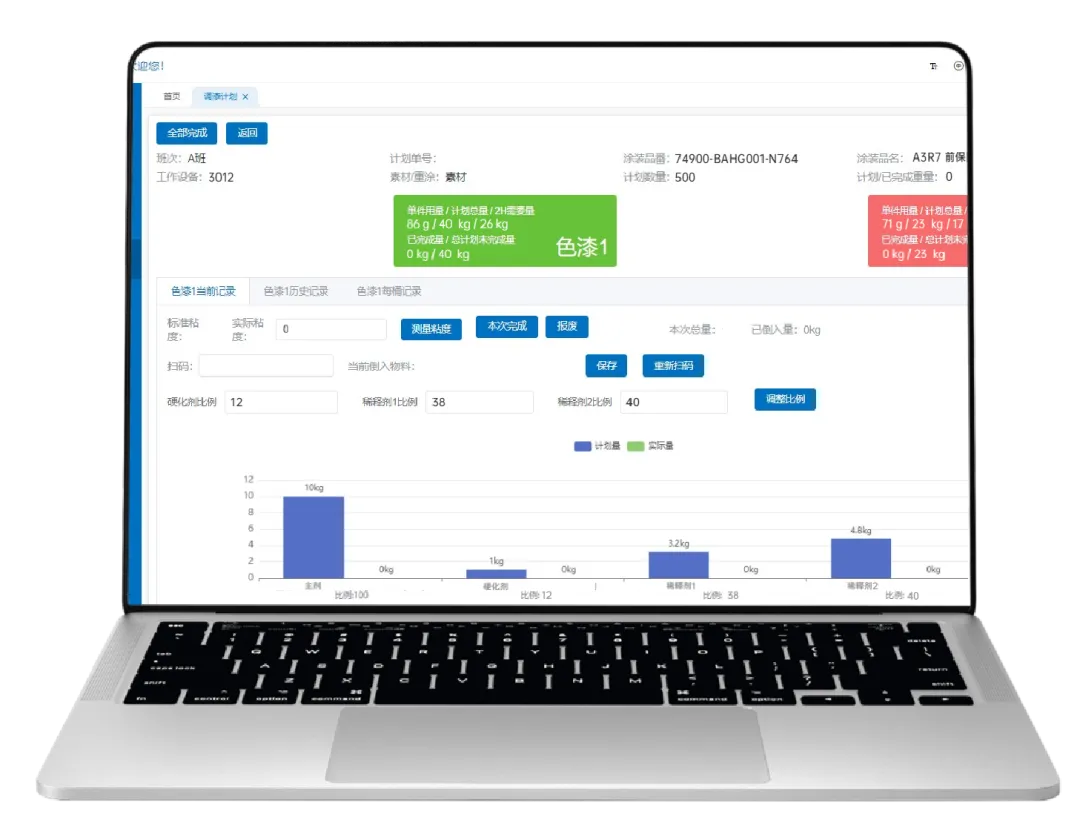 當(dāng)某種原料倒入過多,系統(tǒng)彈窗報(bào)警,經(jīng)上級權(quán)限確認(rèn)后系統(tǒng)根據(jù)給定配比,自動更新各原料所需重量。整個(gè)調(diào)漆過程,操作員只需遵循系統(tǒng)操作流程倒入原料,大大降低調(diào)漆人員準(zhǔn)入門檻,打破傳統(tǒng)依賴經(jīng)驗(yàn)的調(diào)漆模式。