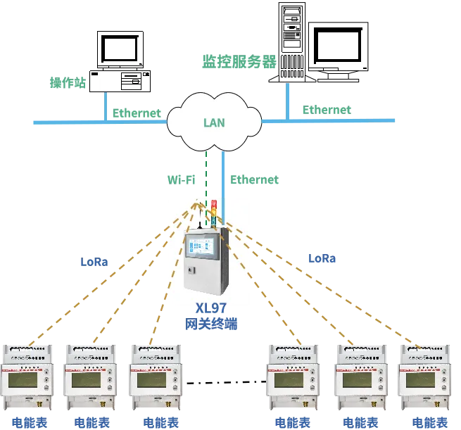 DTSD3366D/XL系列三相電子式電能表,通過LoRa無線傳輸電流數(shù)據(jù)至XL97網(wǎng)關(guān)終端,可實現(xiàn)就地監(jiān)控;XL97網(wǎng)關(guān)終端通過Ethernet或Wi-Fi推送數(shù)據(jù)至監(jiān)控平臺,實現(xiàn)遠程監(jiān)控。