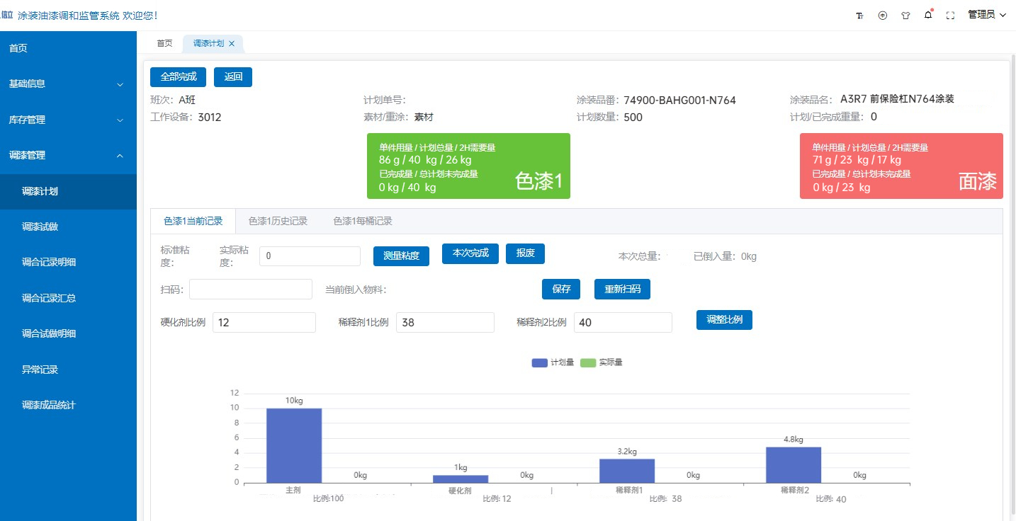 系統(tǒng)采用可視化直觀調漆界面設計,根據(jù)調漆計劃智能匹配調漆工藝,自動計算主劑、固化劑、稀釋劑需要的重量,以色塊的形式實時顯示已倒入的原料重量。