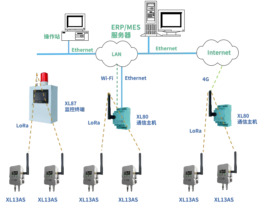 XL13AS無線風(fēng)管風(fēng)速傳感器通過LoRa無線傳輸方式,將數(shù)據(jù)上傳至XL802通信主機(jī),通信主機(jī)可選以太網(wǎng)、Wi-Fi、4G通信方式,推送數(shù)據(jù)至監(jiān)控平臺(tái)、企業(yè)生產(chǎn)管控服務(wù)器等。
