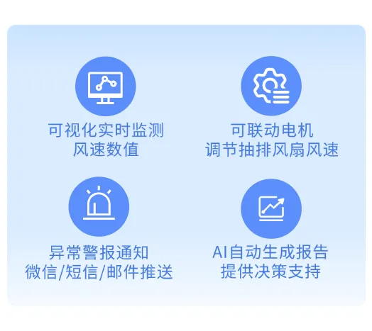 根據(jù)現(xiàn)場(chǎng)需求,可聯(lián)動(dòng)電機(jī),當(dāng)風(fēng)速過小或者過大,自動(dòng)調(diào)節(jié)抽排風(fēng)扇的轉(zhuǎn)速,以保持風(fēng)速控制在合適范圍內(nèi)。