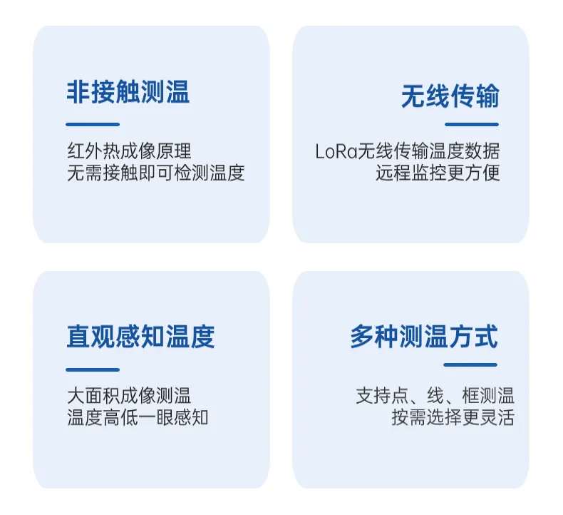 采用XL16IT無線紅外熱成像測(cè)溫傳感器,實(shí)現(xiàn)對(duì)配電柜、變壓器等電氣設(shè)備母線、銅排、電纜連接部位的非接觸式溫度監(jiān)測(cè)。配置氧化釩非制冷型探測(cè)元件,可同時(shí)監(jiān)測(cè)10個(gè)點(diǎn)、10個(gè)框、1條線的溫度,測(cè)溫范圍廣、精度高。