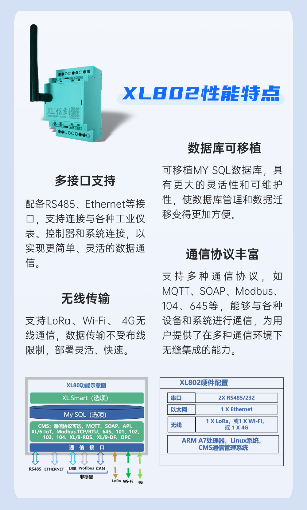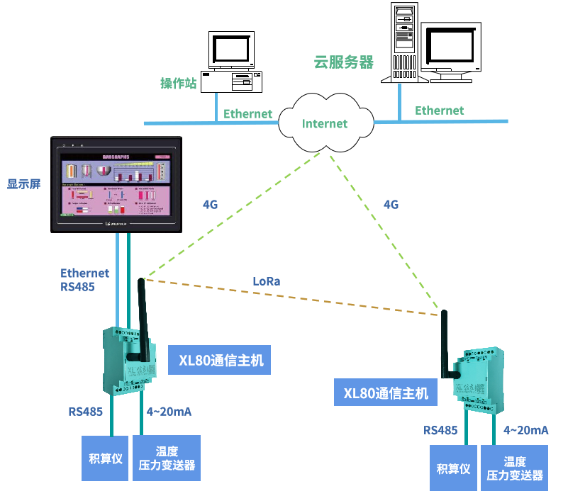 XL802通信主機(jī),可同時將數(shù)據(jù)推送到現(xiàn)場顯示儀表、物聯(lián)網(wǎng)關(guān),實(shí)現(xiàn)現(xiàn)場就地監(jiān)控和平臺遠(yuǎn)程監(jiān)控。