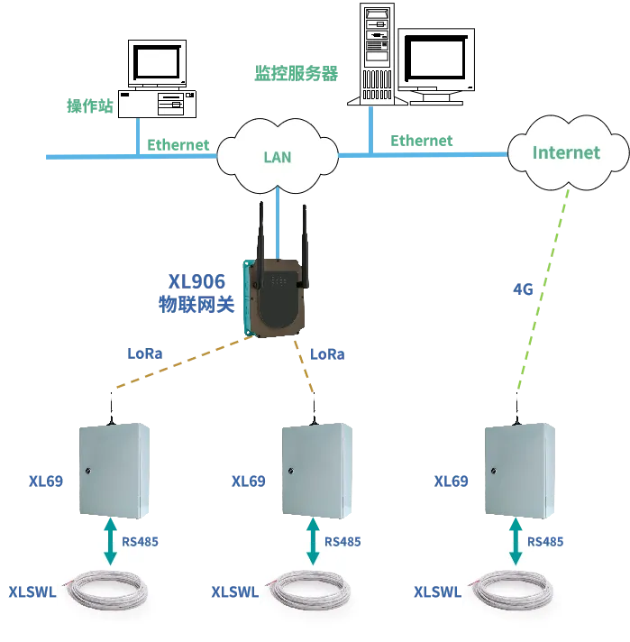 接入企業(yè)監(jiān)控平臺(tái):XL69無(wú)線采集終端采用LoRa無(wú)線傳輸數(shù)據(jù)至XL90網(wǎng)關(guān),網(wǎng)關(guān)通過(guò)Ethernet/WiFi等方式接入監(jiān)控平臺(tái);